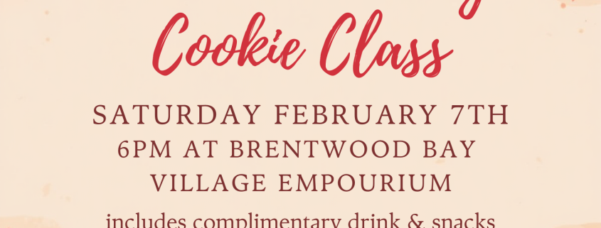 Come join me on Saturday February 7th at 6pm and indulge yourself with an evening of cookie decorating, snacks and a drink! I will teach you the basics of using royal icing which you will then use to complete a Valentine’s Day themed cookie set. You will go home with your 6 decorated cookies, any left over icing and sprinkles from your kit provided at class, plus there is a door prize!